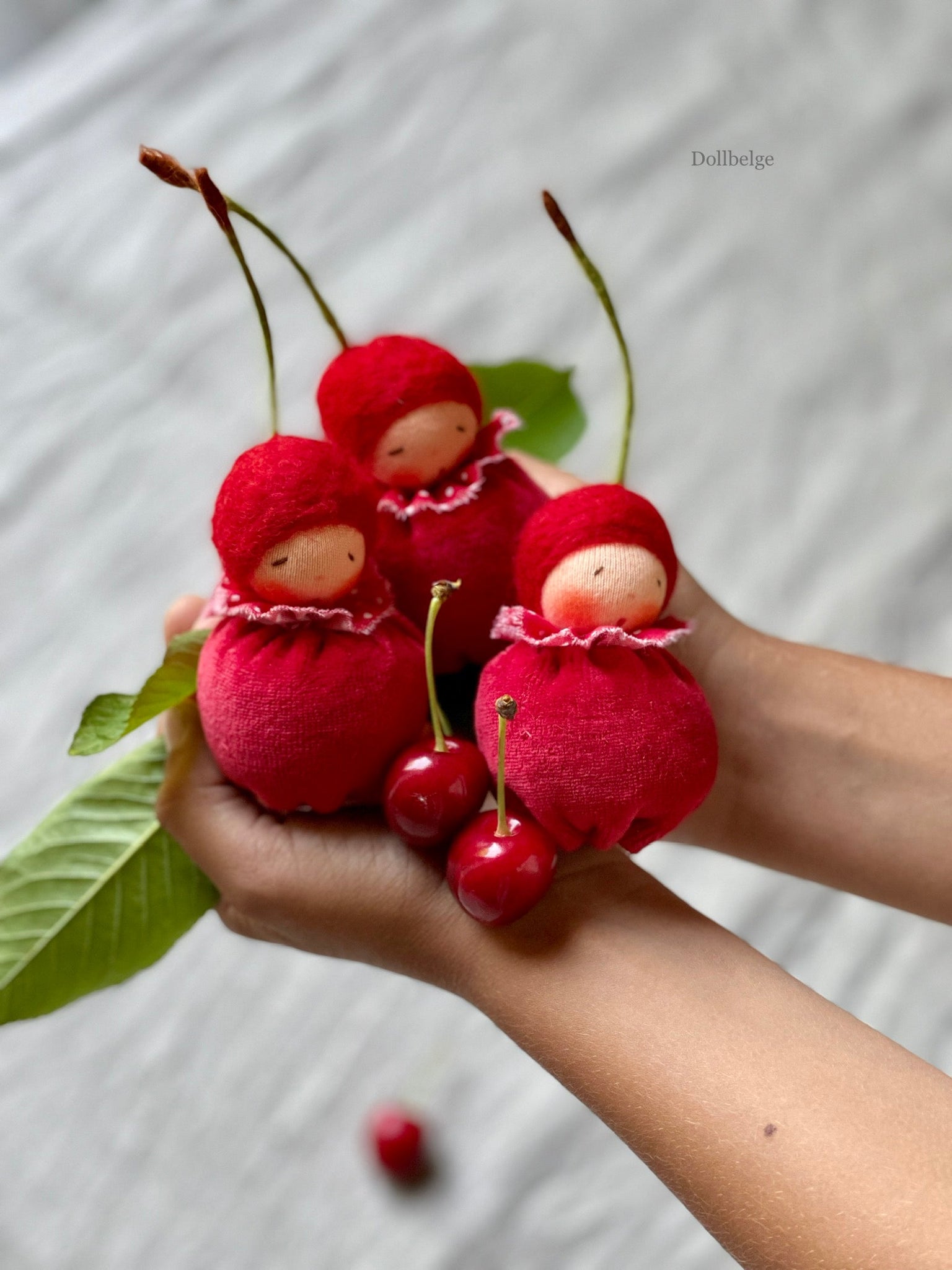 Tiny Cherry made from Nicky velours, White Angel cotton, stuffed with bio wool. 100% Natural.
