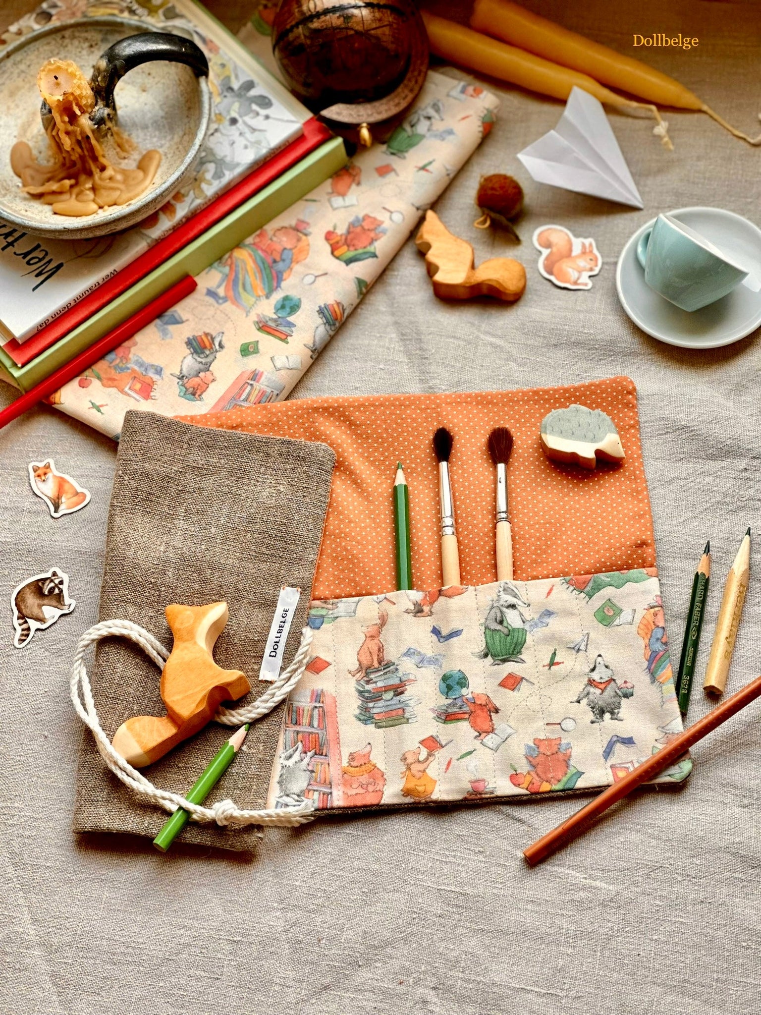 Handmade from home made vintage linen and organic cotton. It can hold 15 pencils, pens or paint brushes.