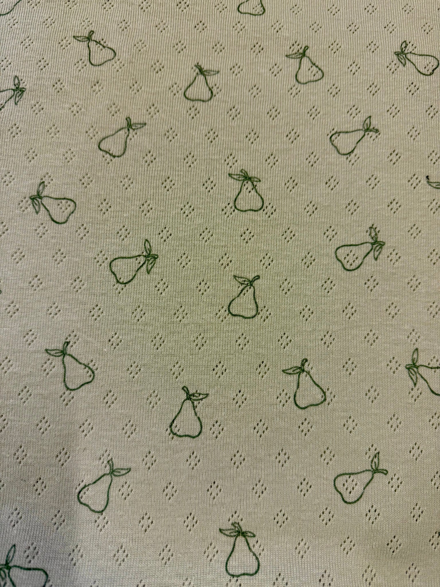 You can chose from 3 colors of Pointelle jersey from 100% Öko-tex cotton and 1 Double Gauze, also 100% Öko-tex cotton and even 2 Magic pins from Taylor Seville Europe and a Golden eye needle from Clover are included.