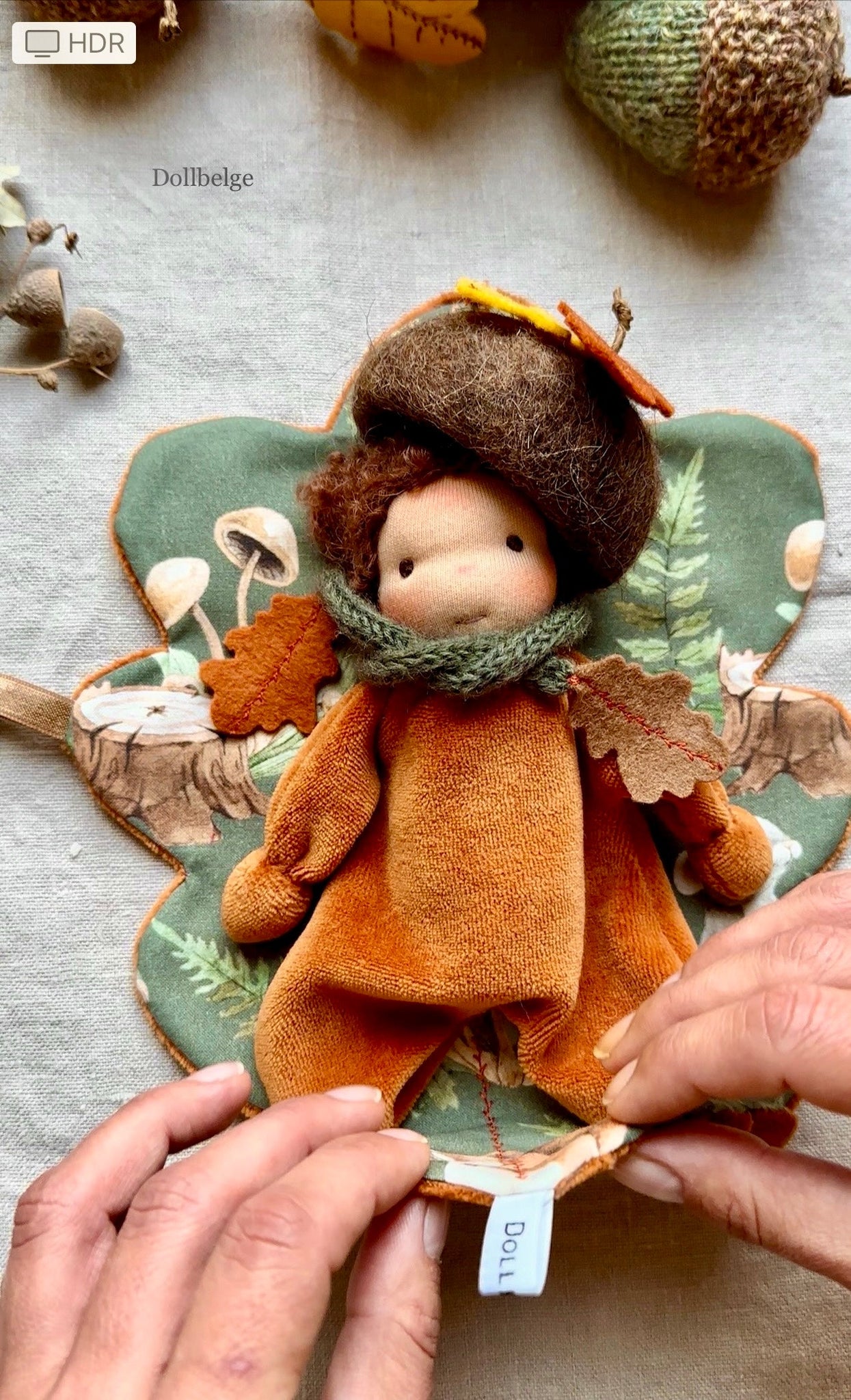 Handmade Acorn Fairy from the softest Nicky velours, bio wool inside. She comes in a Acorn Wicker Basket with handmade foldable acorn leaf blanket, felted bonnet, knitted scarf, knitted acorn and a little basket with acorns. 100% Natural.