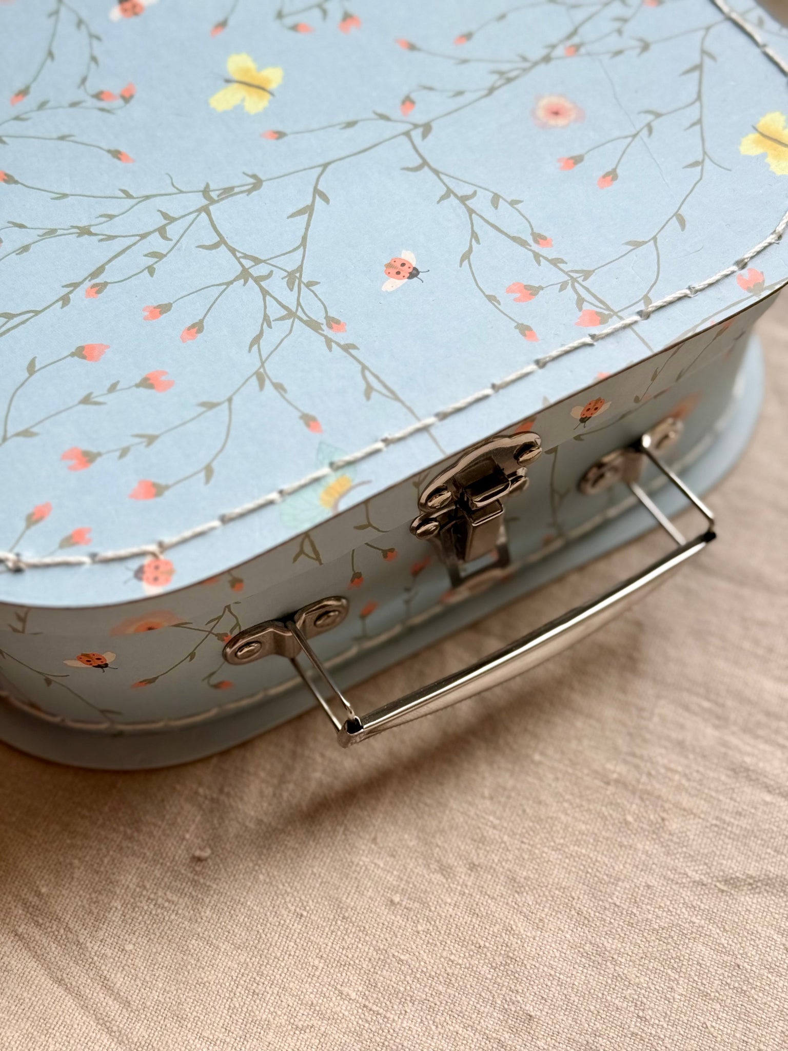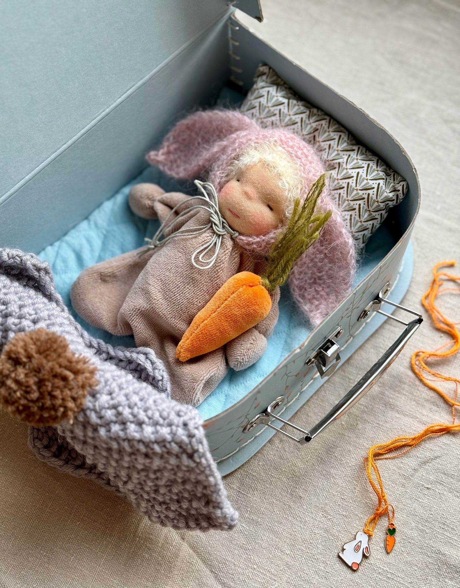 Cuddle Bunny is handmade from the softest Nicky velours, White Angel cotton and stuffed with bio wool. It comes with knitted bonnet from kid mohair/silk, necklace and its carrot friend in a suitcase with handmade bedding. 100% Natural.