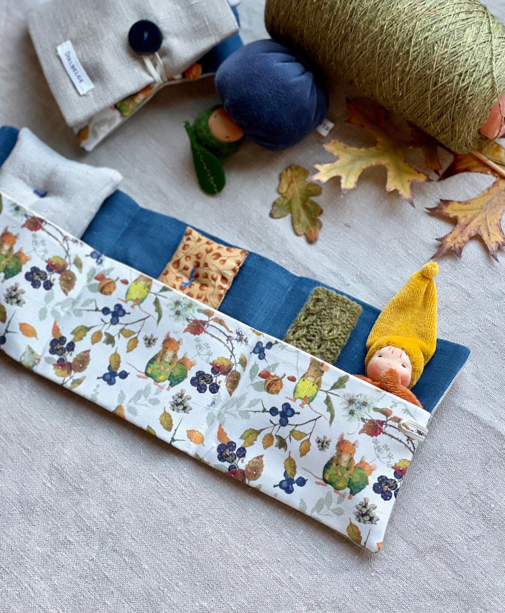 Handmade Tiny Gnome from Nicky velours. He comes in a Travel Case with his Accessories. Travel Case made from organic cotton and linen with 3 compartments: for the linen mattress with wool inside, for a cotton pillow with wool inside and for the Tiny Gnome with knitted Blanket.