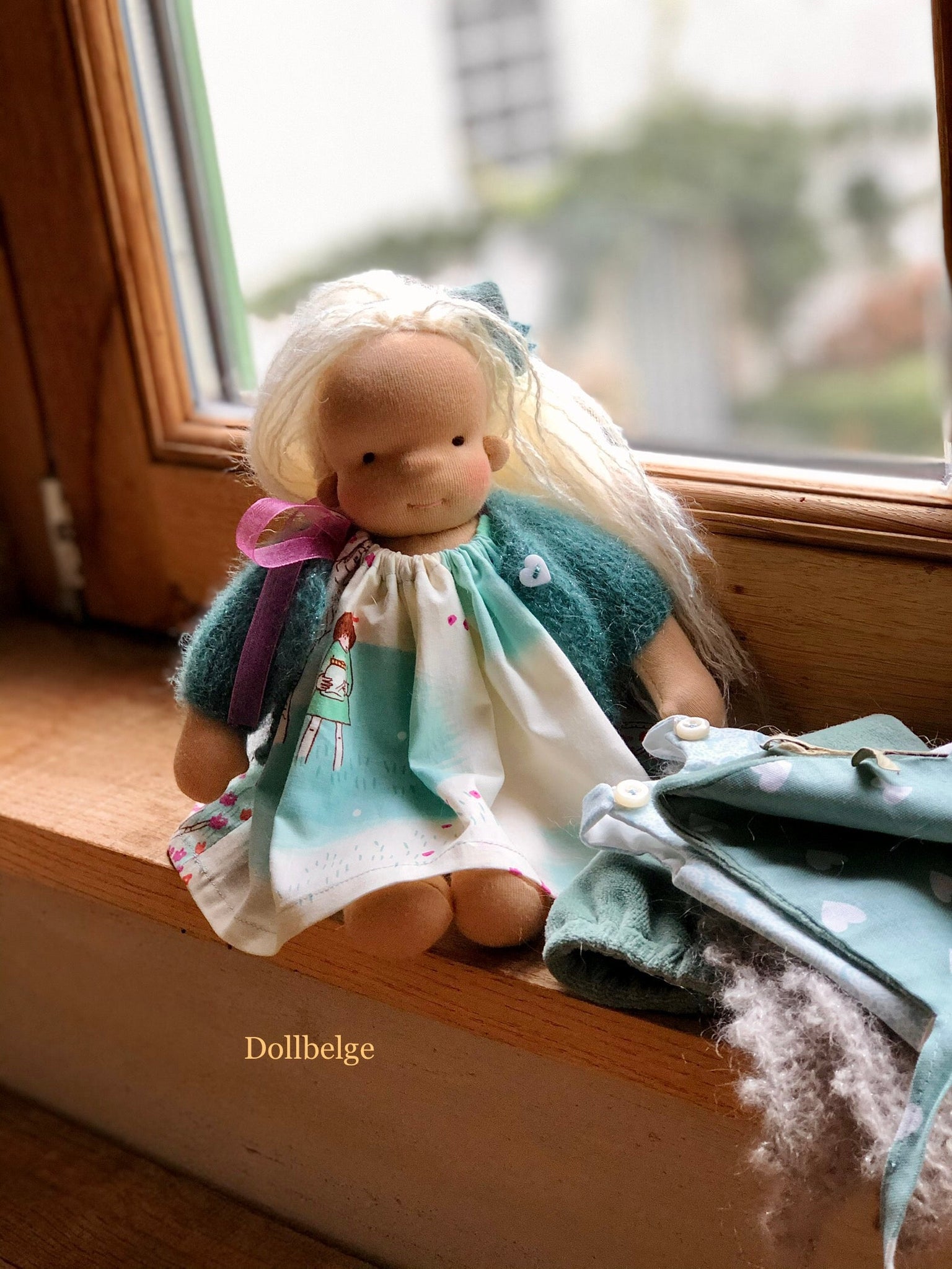 Handmade - 30 cm - White Angel cotton, stuffed with bio wool, hair from mohair and wool, she wears a cotton dress, underwear and socks, knitted jacket from finest merino wool/mohair/silk - pictures are examples.