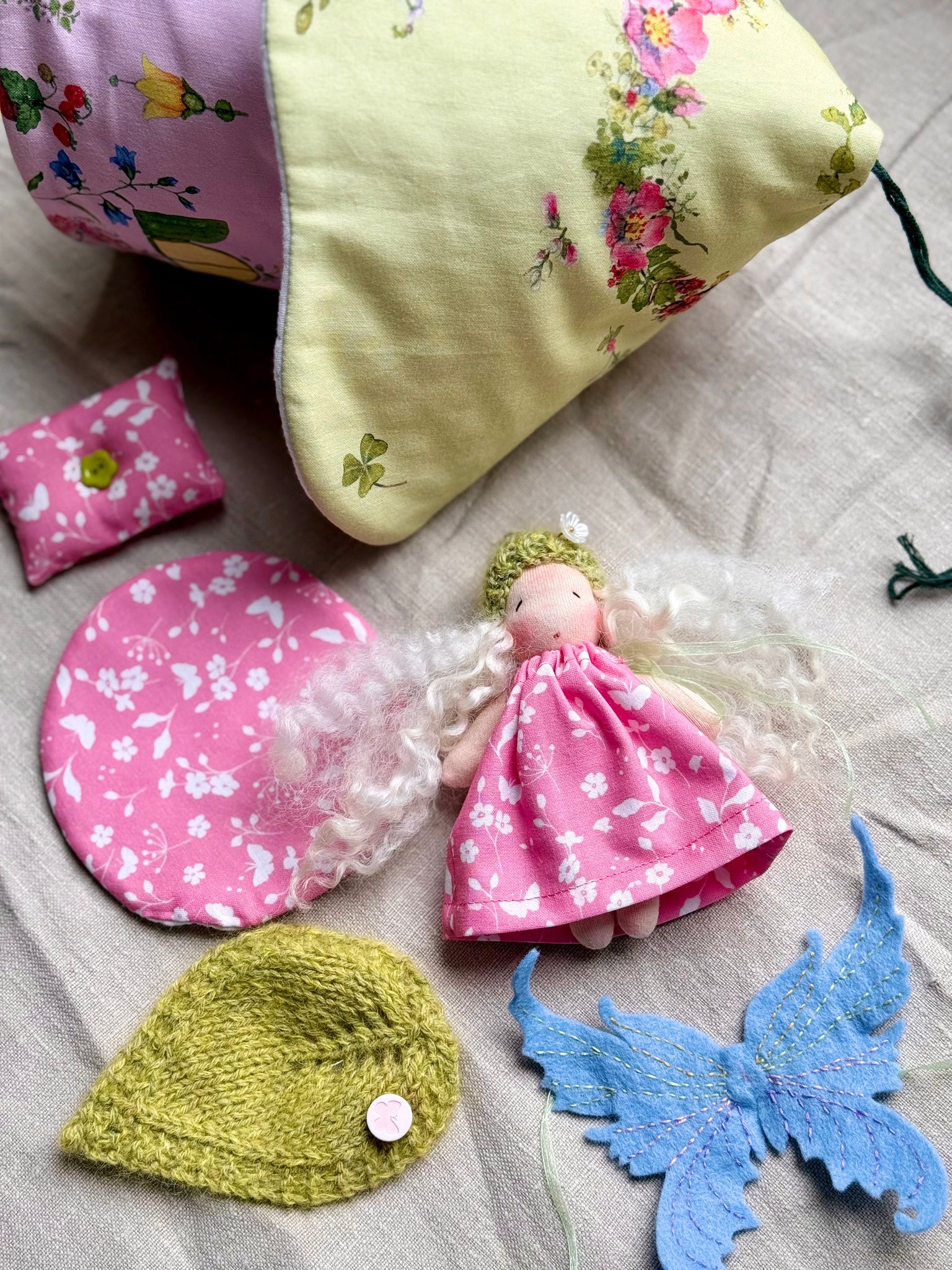 Optionally you can add the handmade Fairy Abby with hand embroidered removable wings, bedding and knitted leaf blanket.