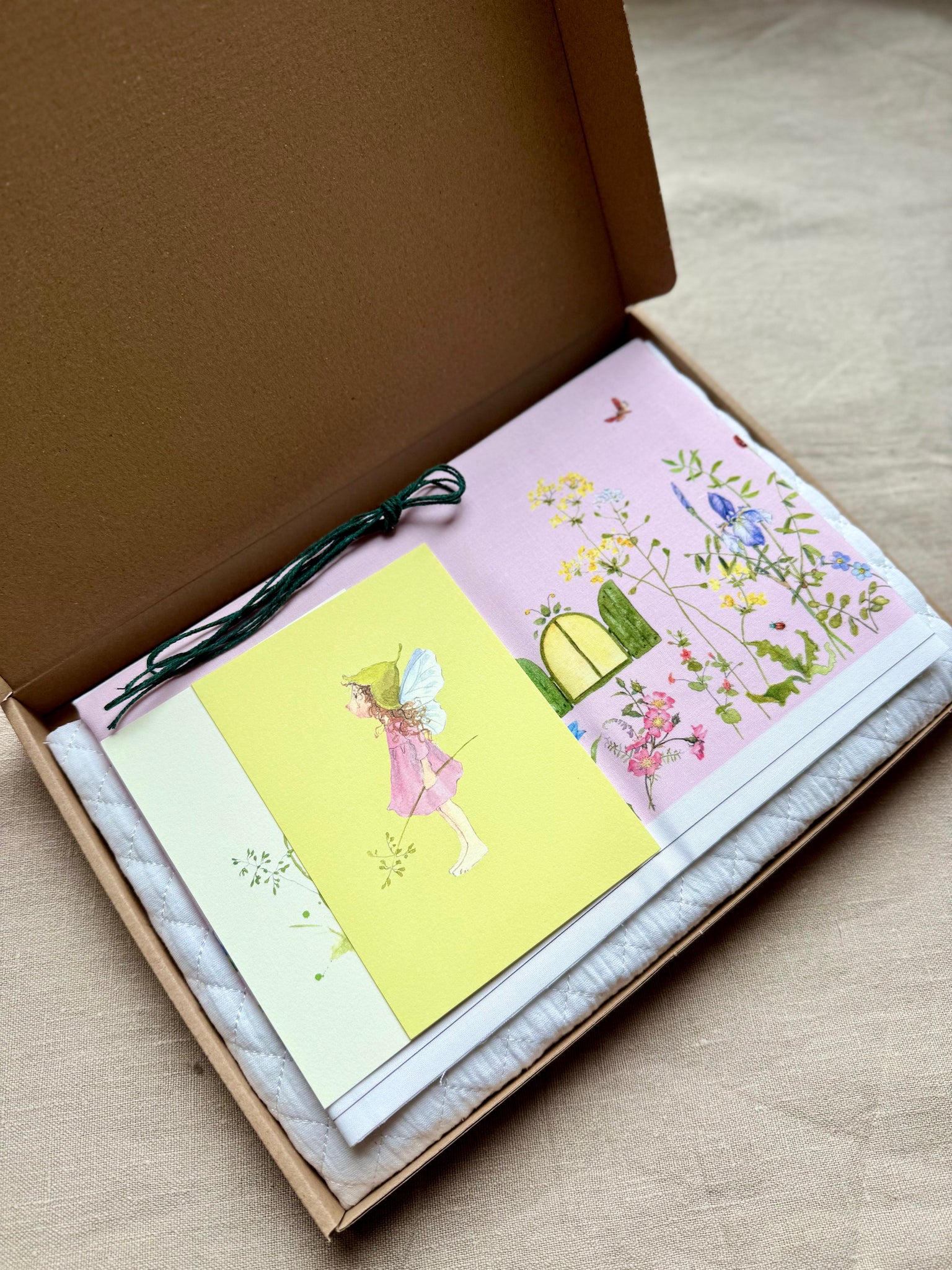 Included is padded cotton for the lining, a twisted cord and 2 Postcards, eco printed in Belgium on Munken Pure heavy paper and featuring beautiful garden Fairies, illustrated by Daniela Drescher.