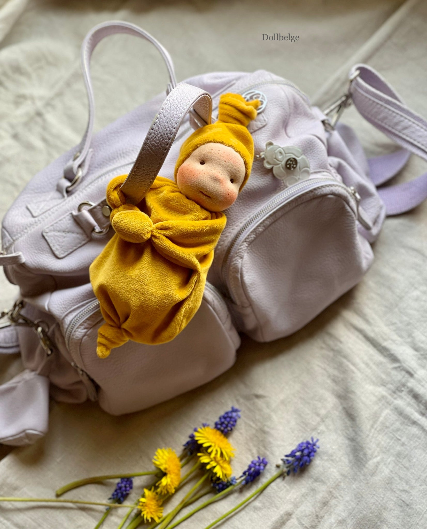Handmade with love - 28 cm - from White Angel Ökotex cotton, the softest Nicky velours and stuffed with bio wool. The doll has 2 sew-in plastic covered (waterproof and rustproof) magnets in her palms so you can easily and safely attach the doll to the nursery bag, a trolley, a buggy, a push chair etc. - as to don't lose this precious buddy!