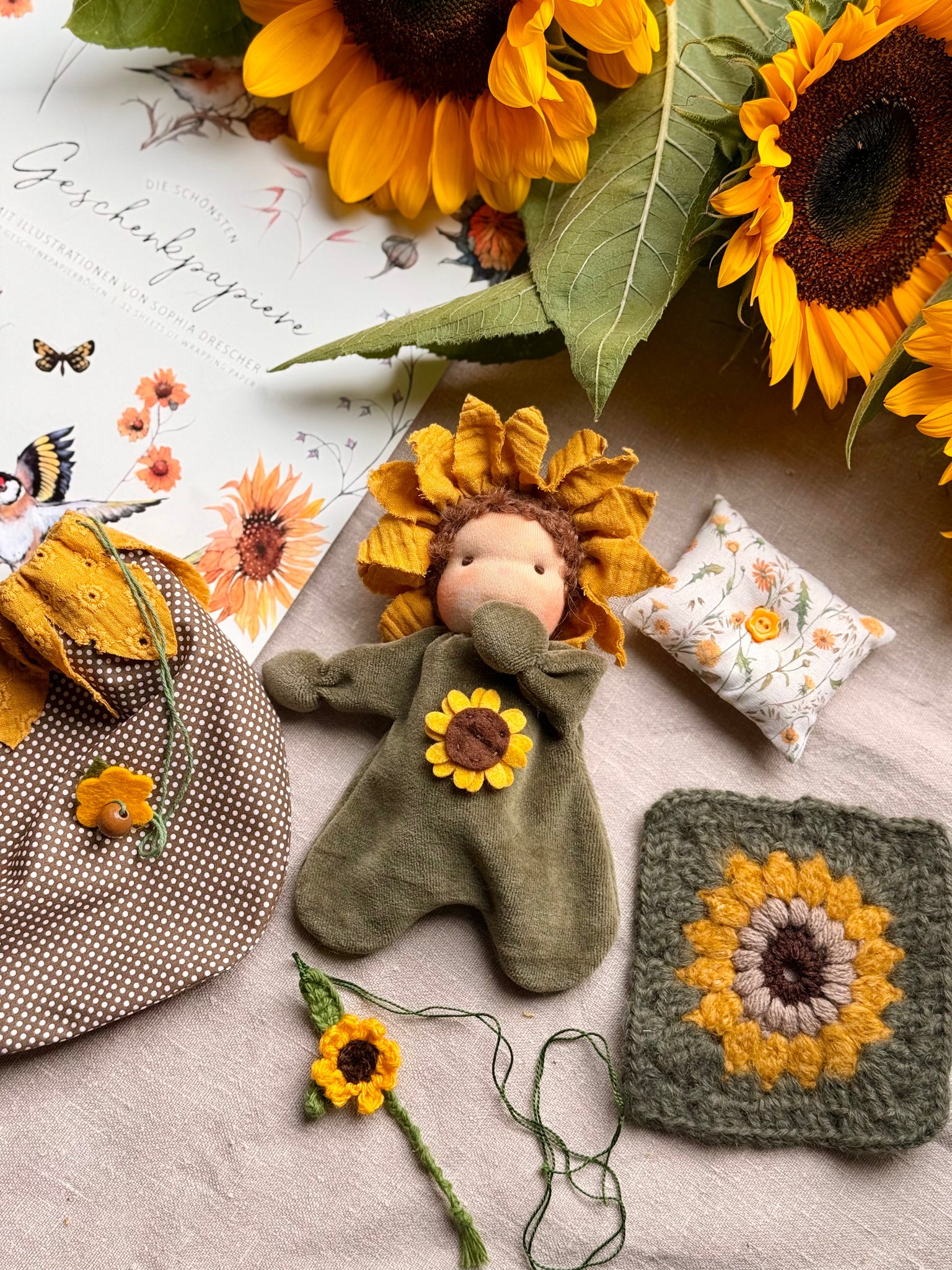 Cuddle Sunflower Doll is handmade from the softest Nicky velours, embroidered by hand. She comes in the Sunflower Bag with handmade pillow, granny square blanket and sunflower necklace. 100% Natural.