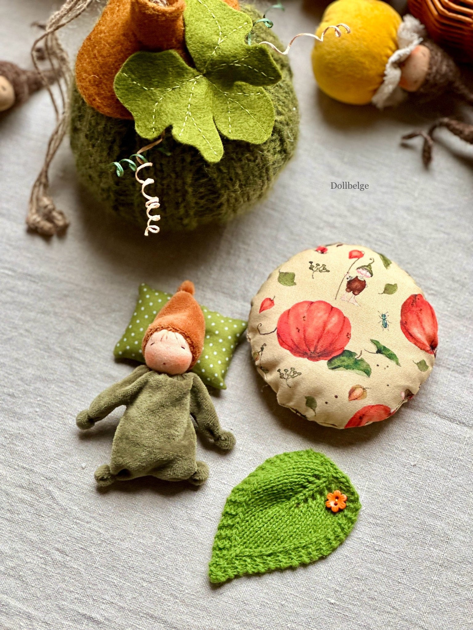 Tiny Gnome handmade from the softest Nicky velours, bio wool inside, comes in the knitted Pumpkin Bag with his accessories. 100% natural.