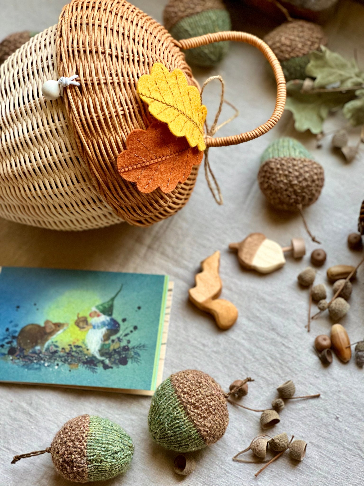 Handmade Gnome 8 cm from Nicky velours, bio wool inside. He comes in a wicker Acorn Basket with his accessories: handmade foldable blanket, acorn mattress, pillow and knitted leaf blanket from Merino/Cashmere with his wooden and knitted acorn friends. 100% Natural.