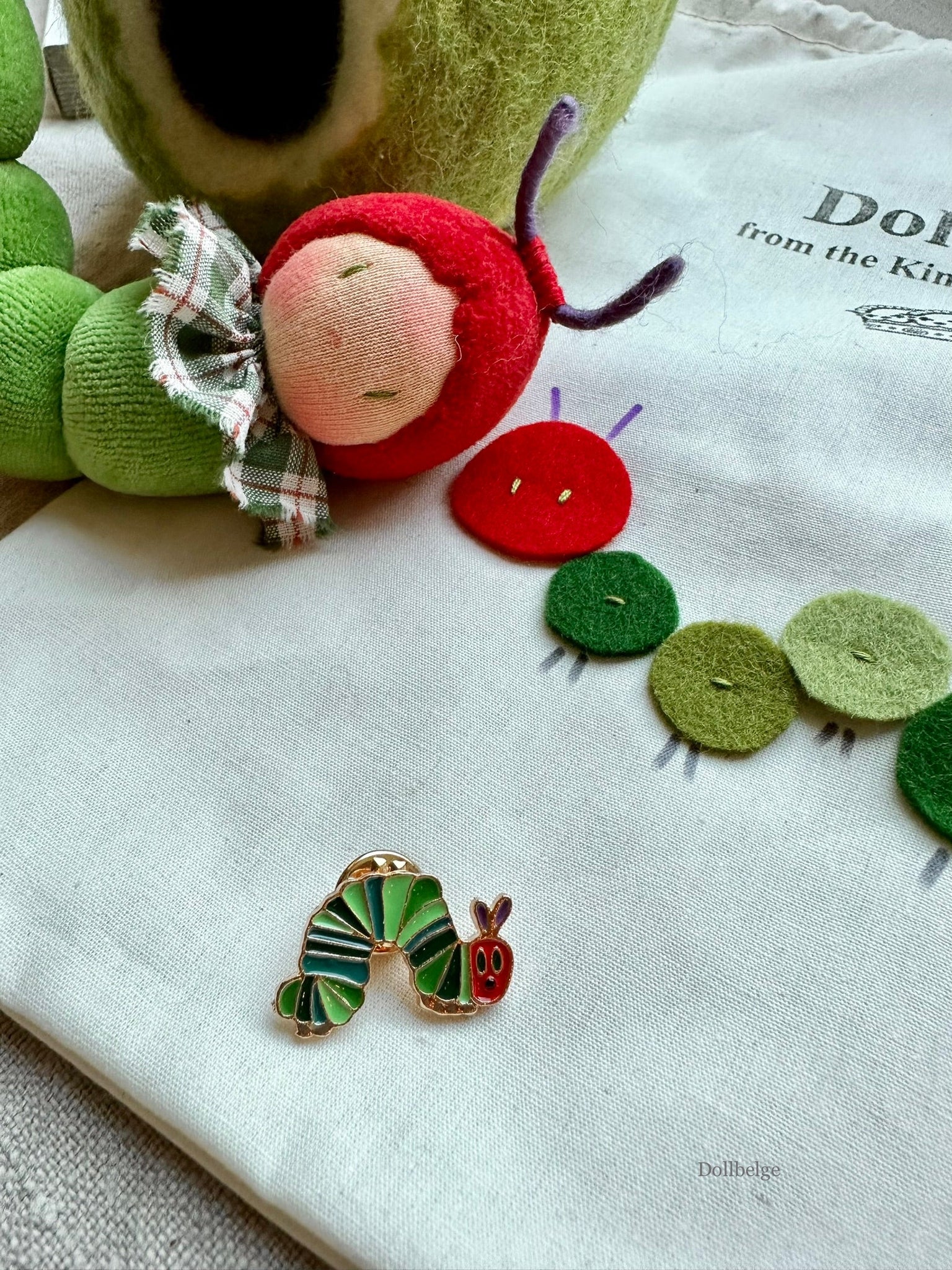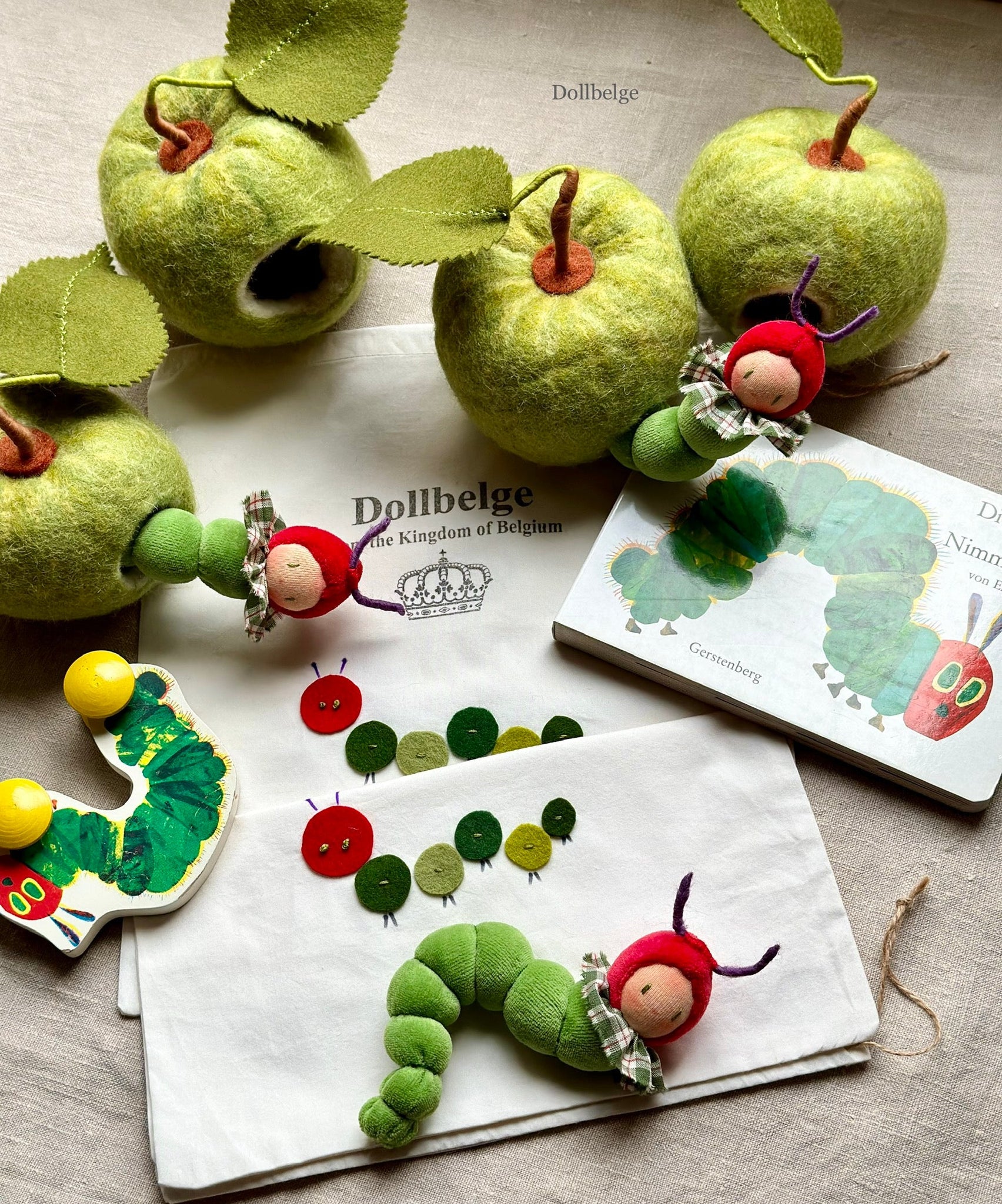 Handmade from Nicky velours, bio wool inside, +/- 20 cm long, it comes with/in an Apple which is felted from wool, a metal caterpillar pin which you can add to a jacket or pullover, etc. and a cotton bag with a little embroidery of a caterpillar.